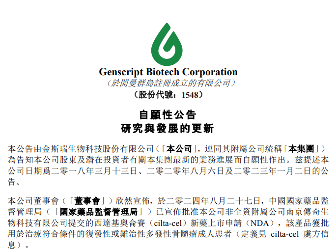 8月27日,金斯瑞發(fā)布公告稱,其非全資附屬公司傳奇生物自主研發(fā)的細(xì)胞治療產(chǎn)品卡衛(wèi)荻(通用名:西達(dá)基奧侖賽注射液)獲得國家藥品監(jiān)督管理局批準(zhǔn)上市,用于治療復(fù)發(fā)或難治性多發(fā)性骨髓瘤成人患者,既往接受過至少三線治療后進(jìn)展(至少使用過一種蛋白酶體抑制劑及免疫調(diào)節(jié)劑)。值得一提的是,西達(dá)基奧侖賽也成為在國內(nèi)獲批的第6款CAR-T產(chǎn)品。