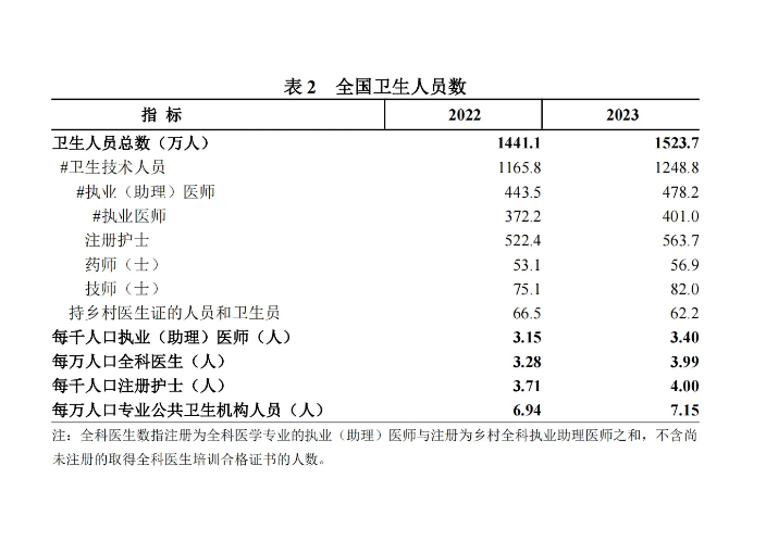 2023 年末,全國衛(wèi)生人員總數(shù)1523.7 萬人,比上年增加 82.7 萬人(增長 5.7%)。