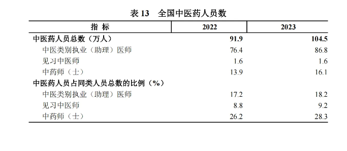 2023 年,全國中醫(yī)藥衛(wèi)生人員總數(shù) 104.5 萬人,比上年增加 12.6 萬人(增長 13.8%)。其中:中醫(yī)類別執(zhí)業(yè)(助理)醫(yī)師 86.8 萬人,中藥師(士)16.1 萬人。兩類人員較上年均有所增加(見表 13)。