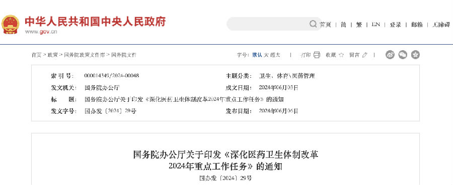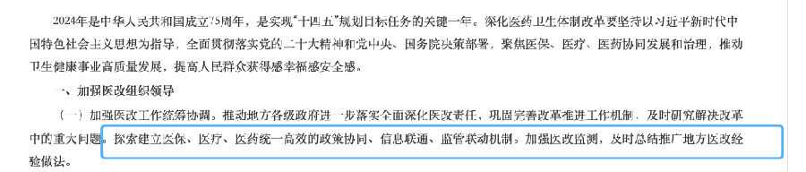 2024年6月初,國務(wù)院辦公廳發(fā)布《深化醫(yī)藥衛(wèi)生體制改革2024年重點工作任務(wù)》,就推動地方各級政府進一步落實全面深化醫(yī)改責(zé)任,探索建立醫(yī)保、醫(yī)療、醫(yī)藥統(tǒng)一高效的政策協(xié)同、信息聯(lián)通、監(jiān)管聯(lián)動機制,做了全面要求。