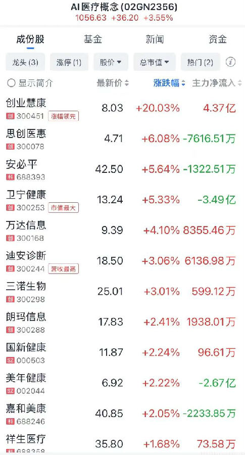 3月10日,AI醫(yī)療概念股迎來大漲。A股方面,塞力醫(yī)療、潤達醫(yī)療、創(chuàng)業(yè)慧康等封板漲停,思創(chuàng)醫(yī)惠、安必平、衛(wèi)寧健康、迪安診斷、美年健康等漲幅靠前。港股方面,方舟健客、訊飛醫(yī)療、醫(yī)渡科技等也迎來不同程度的上漲。在業(yè)內(nèi)看來,AI醫(yī)療板塊的異常活躍是受到華為在消息面上的提振。