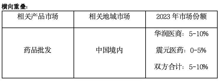 在相關(guān)產(chǎn)品市場的國內(nèi)藥品批發(fā)領(lǐng)域,華潤醫(yī)商在2023年的市場份額為5-10%,而震元醫(yī)藥市場份額為0-5%,雙方合計(jì)份額為5-10%。