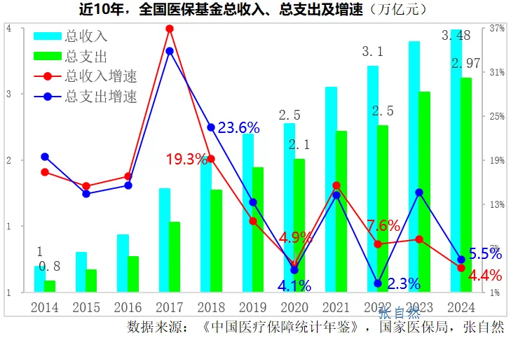 《快報(bào)》顯示,2024年,全國醫(yī)?;?strong style="-webkit-tap-highlight-color:transparent;margin:0px;padding:0px;outline:0px;max-width:100%;box-sizing:border-box !important;overflow-wrap:break-word !important;visibility:visible;">總收入34809.95億元,總支出29675.92億元,分別較上年增加4.4%、5.5%,支出增速與收入增速的協(xié)調(diào)性有所增強(qiáng),支出過快增長的態(tài)勢有所遏制。其中,這個(gè)收入增速是多地支持企業(yè)減輕負(fù)擔(dān)、降低醫(yī)保費(fèi)率的背景下實(shí)現(xiàn)的,實(shí)現(xiàn)了基金收入穩(wěn)定與促進(jìn)經(jīng)濟(jì)恢復(fù)的統(tǒng)籌。