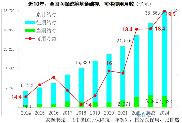 2024年,全國醫(yī)保統(tǒng)籌基金收入28507.29億元(其中,職工醫(yī)保統(tǒng)籌基金收入17368.93億元,居民醫(yī)?;鹗杖?1138.36億元)、統(tǒng)籌基金支出23824.42億元(其中,職工醫(yī)保統(tǒng)籌基金支出13205.04億元,居民醫(yī)?;鹬С?0619.38億元),當(dāng)期結(jié)存4682.87億元,累計(jì)結(jié)存38662.62億元,可供使用19.5個(gè)月,較上年增加了1.03個(gè)月,統(tǒng)籌基金的緩沖能力增強(qiáng)。