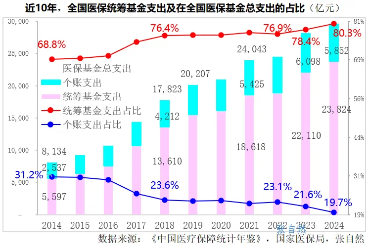 《快報(bào)》顯示,全國醫(yī)?;鹂傊С?9675.92億元,其中,統(tǒng)籌基金支出23824.42億元、個(gè)人賬戶支出5851.1億元,分別占了全國醫(yī)?;鹂傊С龅?0.3%、19.7%。統(tǒng)籌基金的占比較上年增加了2個(gè)百分點(diǎn),說明醫(yī)保基金的共濟(jì)效能進(jìn)一步增強(qiáng)。部分是因個(gè)賬記賬方式改革(將單位幫職工繳納的原計(jì)入職工個(gè)人賬戶的部分資金改為計(jì)入職工統(tǒng)籌賬戶)2023年全面落地所致。(詳見下圖)