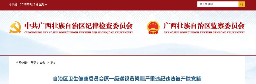 近日,廣西自治區(qū)紀檢委發(fā)布通報,廣西自治區(qū)衛(wèi)健委原一級巡視員梁某嚴重違紀違法被開除黨籍。