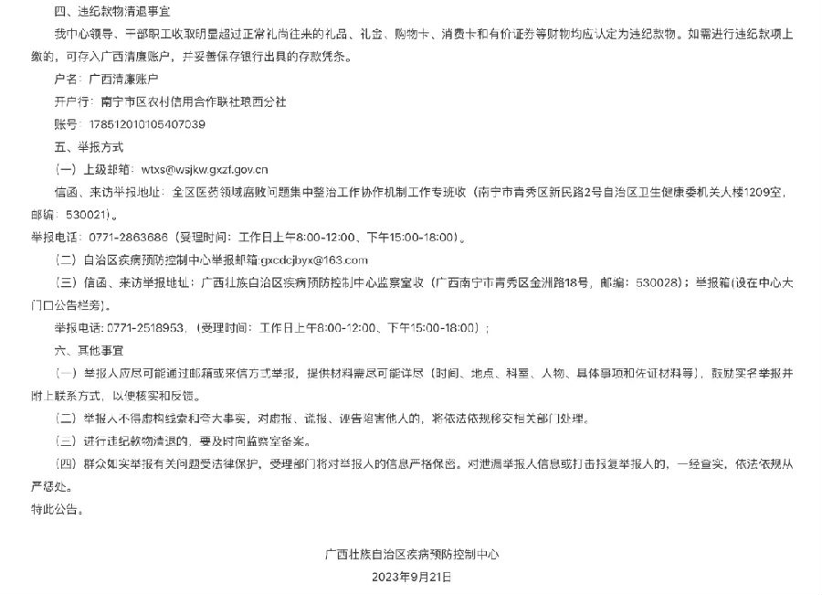 2023年,廣西自治區(qū)疾控中心在展開醫(yī)藥領域腐敗問題集中整治工作時也曾就違紀款物清退等公開了清廉賬戶及舉報方式,并在公告中明確,單位領導、干部職工收取明顯超過正常禮尚往來的禮品、禮金、購物卡、消費卡和有價證券等財物均應認定為違紀款物。