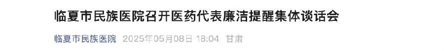 5月9日,甘肅榆中縣第一人民醫(yī)院召開(kāi)醫(yī)藥(貨物)購(gòu)銷(xiāo)領(lǐng)域代表廉政集體約談暨廉潔承諾書(shū)簽訂會(huì),醫(yī)院重點(diǎn)崗位負(fù)責(zé)人及醫(yī)藥(貨物)購(gòu)銷(xiāo)領(lǐng)域代表共130人參加會(huì)議;5月8日,甘肅臨夏市民族醫(yī)院召開(kāi)醫(yī)藥代表廉潔提醒集體談話會(huì),其中30家醫(yī)藥配送企業(yè)代表參加了此次會(huì)議。