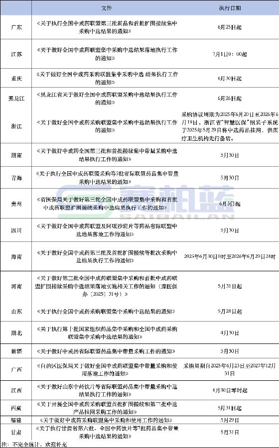 全國(guó)中成藥聯(lián)盟集采中選結(jié)果,多省陸續(xù)執(zhí)行。 01 大批中成藥 集采中選結(jié)果將落地 據(jù)賽柏藍(lán)梳理,目前至少已經(jīng)有19省/市/自治區(qū)發(fā)布全國(guó)中成藥聯(lián)盟第三批集采中選結(jié)果落地安排。 第三批全國(guó)中成藥集采已于2025年4月起在各省陸續(xù)落地執(zhí)行。湖北是最早執(zhí)行的省份之一,于4月30日開始執(zhí)行。其他省份的執(zhí)行時(shí)間有所不同,大多集中在5月末和6月執(zhí)行,具體如下。 全國(guó)中成藥聯(lián)盟集采共涉及20個(gè)產(chǎn)品組、95個(gè)產(chǎn)品,共有174個(gè)藥品中選。而后,又有8個(gè)產(chǎn)品復(fù)活擬中選,134個(gè)非報(bào)價(jià)代表品擬中選。 在不少省份發(fā)布的通知中,明確了采購(gòu)周期以及首個(gè)采購(gòu)周期,并對(duì)采購(gòu)價(jià)格何時(shí)切換作出了時(shí)間安排。 如廣東省在《關(guān)于執(zhí)行全國(guó)中成藥聯(lián)盟第三批新品和首批擴(kuò)圍接續(xù)集中采購(gòu)中選結(jié)果的通知》中稱,此次集中采購(gòu)周期為2025年6月25日至2027年12月31日,首年采購(gòu)周期為2025年6月25日至2026年6月24日。 廣東全國(guó)中成藥采購(gòu)聯(lián)盟第三批集采共有313個(gè)藥品中選,涉及近160家生產(chǎn)企業(yè);廣東全國(guó)中成藥采購(gòu)聯(lián)盟首批擴(kuò)圍接續(xù)集采共有492個(gè)藥品中選,涉及超170家生產(chǎn)企業(yè)。其要求,各市要在集采結(jié)果落地執(zhí)行第3個(gè)月組織對(duì)本市醫(yī)療機(jī)構(gòu)中選藥品進(jìn)院情況開展一輪問題排查等。 江蘇省發(fā)布《關(guān)于做好全國(guó)中成藥聯(lián)盟集中采購(gòu)中選結(jié)果落地執(zhí)行工作的通知》指出,此次集采自2025年7月1日00:00起全省統(tǒng)一執(zhí)行。同時(shí),6月25日-6月30日,將進(jìn)行網(wǎng)簽采購(gòu)合同;6月26日起,江蘇省平臺(tái)切換采購(gòu)價(jià)格,中選企業(yè)本次集采目錄內(nèi)非中選清單產(chǎn)品同步暫停采購(gòu)。 02 中成藥集采 提質(zhì)擴(kuò)面 第三批中成藥集采通過規(guī)則優(yōu)化、強(qiáng)力監(jiān)管及差異化執(zhí)行,實(shí)現(xiàn)了降價(jià)與保量平衡。不完全梳理發(fā)現(xiàn),今年來,全國(guó)多地已經(jīng)進(jìn)行了多個(gè)批次的中成藥單省/省際聯(lián)盟集采。 如安徽省2024年度中成藥集采結(jié)果已經(jīng)公布,11個(gè)藥品中選;廣東聯(lián)盟金蓮花膠囊等中成藥集中帶量采購(gòu),323個(gè)藥品中選,其中175個(gè)藥中選,148個(gè)藥限量中選。 廣東聯(lián)盟金蓮花膠囊等中成藥集中帶量采購(gòu)的品種是廣東聯(lián)盟清開靈等中成藥集中帶量采購(gòu)采購(gòu)清單涉及的藥品劑型,與全國(guó)中成藥聯(lián)盟集中帶量采購(gòu)第三批和首批擴(kuò)圍接續(xù)采購(gòu)品種范圍重疊的藥品劑型不列入其中,廣東聯(lián)盟清開靈等中成藥集中帶量采購(gòu)共有53個(gè)品種中選。 自2020年6月金華市藥品耗材帶量集中采購(gòu)聯(lián)盟委員會(huì)關(guān)于開展金華市第二批藥品帶量采購(gòu)公告發(fā)布后,各地中成藥集采相繼展開,并在分組、競(jìng)價(jià)和中選規(guī)則上持續(xù)完善。 國(guó)家醫(yī)保局計(jì)劃2025將在地方層面開展具備專業(yè)特色的全國(guó)聯(lián)盟采購(gòu)預(yù)計(jì)達(dá)到20個(gè)左右,包括中成藥、中藥飲片以及高值耗材等,預(yù)計(jì)2025年國(guó)家和聯(lián)盟組織開展的藥品集采品種將達(dá)到700個(gè)。 集采提質(zhì)擴(kuò)面下,中成藥集采仍有擴(kuò)容空間。