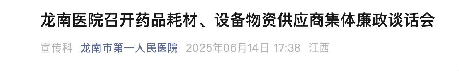 6月14日,江西省龍南市第一人民醫(yī)院召開藥品耗材、設(shè)備物資供應(yīng)商集體廉政談話會,其中有96家藥品耗材、設(shè)備物資供應(yīng)商參會。