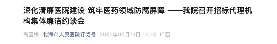 6月13日,廣西北海市人民醫(yī)院召開招標(biāo)代理機構(gòu)集體廉潔約談會,黨委副書記等相關(guān)職能部門負(fù)責(zé)人及十余家招標(biāo)代理機構(gòu)代表共27人參加會議。院黨委書記李曲對招標(biāo)代理機構(gòu)代表提出廉潔要求。她指出:“當(dāng)前,醫(yī)藥領(lǐng)域腐敗問題專項整治工作正在持續(xù)推進,我們醫(yī)院也將強化全流程監(jiān)督,對違規(guī)行為采取‘零容忍’的態(tài)度。”