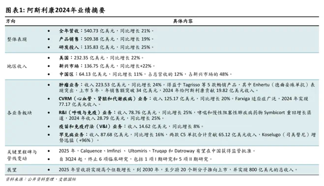 作為阿斯利康第一大業(yè)務(wù)板塊,腫瘤業(yè)務(wù)營(yíng)收占2024年產(chǎn)品總收入的41%,為223.53億美元(+24%)。這主要得益于多款抗腫瘤藥物的穩(wěn)定增長(zhǎng),如Tagrisso(奧希替尼)、Imfinzi(度伐利尤單抗)、Calquence(阿可替尼)、Lynparza(奧拉帕利)、Enhertu(德曲妥珠單抗),同比增速均超過(guò)10%。