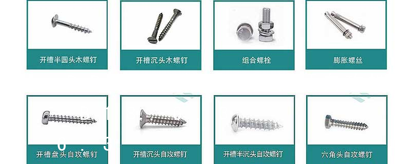 1.機螺釘 2.自攻螺釘 3.鉆尾螺釘 4.墻板釘 5.纖維板釘 6.木螺釘7.六角木螺釘 8.不脫出螺釘 9.組合螺釘 10.微型螺釘 11.家具螺釘 12.電子螺釘 13.鏈帶螺釘頭型 :1.六角頭(hexagon head)2.六角頭法蘭面(hexagon head with flange)3.方頭(square head)4.T形頭T head (hammer head5.