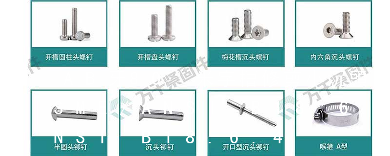 1.機(jī)螺釘 2.自攻螺釘 3.鉆尾螺釘 4.墻板釘 5.纖維板釘 6.木螺釘7.六角木螺釘 8.不脫出螺釘 9.組合螺釘 10.微型螺釘 11.家具螺釘 12.電子螺釘 13.鏈帶螺釘頭型 :1.六角頭(hexagon head)2.六角頭法蘭面(hexagon head with flange)3.方頭(square head)4.T形頭T head (hammer head5.