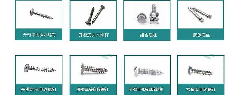 木螺釘有十字槽沉頭、十字槽半沉頭、十字槽圓頭、開槽(一字槽)沉頭、開槽半沉頭、開槽圓頭、六角頭等幾種,公稱直徑有1.6、2、2.5、3、3.5、4、5、6、7、8、10等系列,長度有6、8、10、12、16、20、25、3